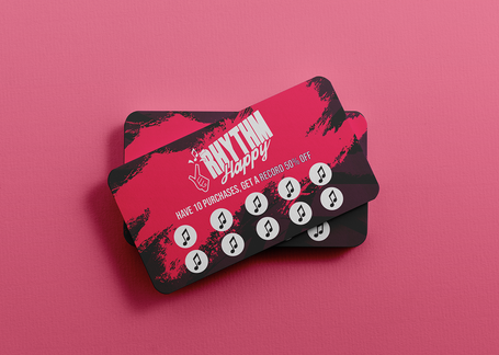 To enhance Rhythm Happy's loyalty cards and other marketing materials while reinforcing their riot grrrl identity, I incorporated elements such as graffiti, ink scribbles, and splotches. These additions add texture and a bold personality to the vibrant pinks and reds used in the design.